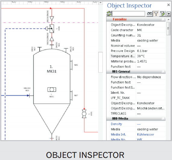 - Alle Symbole und Zeichnungselemente haben verbundene Eigenschaften (z.B. Medien, Rohrklasse, Material, Druck, Temperatur)